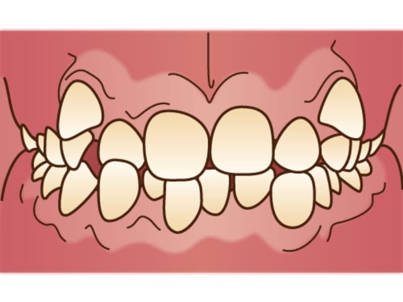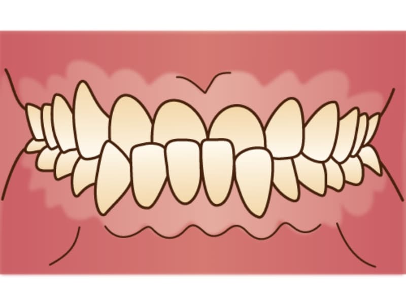 歯の大きさに対して顎の大きさが小さい場合におこります。顎の成長は遺伝にも左右されますが、日々の食事の仕方によっても影響を受けます。お茶などによる流し込みは舌を使わないので顎の成長が弱くなりやすいため注意しましょう。